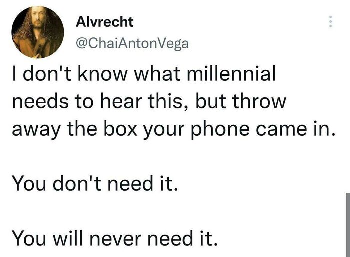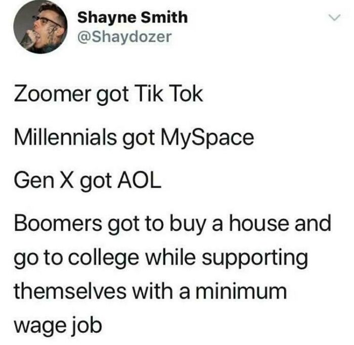 Every generation goes through a unique set of joys and challenges, and millennials are in no way an exception. Born somewhere between 1981 and 1996, they have lived through numerous significant events in history that shaped them into the thirty/forty-somethings we know and cherish today. For example, they’ve witnessed the rise of the internet, which is one of the reasons they’re typically quick to adapt to new technology (at the same time cherishing memories of burning their favorite songs onto a CD). We have delved into the depths of the internet to find posts that ought to be relatable to any millennial out there. Shared on the subreddit titled exactly that—’Millennials’—they cover everything from their daily struggles now to nostalgia-filled memories about life back in the day, and much more. Scroll down to find the internet pearls on the list below and enjoy. #1 Meirl Image credits: Sairacaz20 #2 I *think* Mine Was Called “Color Jams” Where All The Song Titles Had A Color In Them Image credits: InspiraSean86 #3 Personally Attacked Image credits: WarmCanadiehn #4 … Image credits: nicholashoneywell #5 10 Cents Per Text Msg. Lotr Image credits: iota1atg #6 You Either Die A Teenager Or Live Long Enough For Your Adolescence To Become Part Of An Exhibit Image credits: ThisGuy-NotThatGuy #7 Funny How That Works Image credits: JoHeller #8 Millennial Lifecyc Reup Image credits: iota1atg #9 The Neverending Chore Liiiiist Image credits: InspiraSean86 #10 The Last One Sealed It For Me Image credits: MeanCow6 #11 Dam Image credits: nicholashoneywell #12 Millennial Gravestones Image credits: ForRedditFun #13 Scrolling To Birth Year Image credits: iota1atg #14 Can Confirm. I Try To Get What's Best But Also Affordable For My Kitty Image credits: DoomyEyes #15 Offline Childhood Image credits: iota1atg #16 The "Copy But Not Recognise" Generation Image credits: iota1atg #17 Hi Image credits: nicholashoneywell #18 Saw This And Had To Pass It Along Image credits: JmnyCrckt87 #19 Texting Is Polite. U Call Or Text ? Image credits: iota1atg #20 Darn Millennials Wanting To Be Able To Have A Living Wage Image credits: MeanCow6 #21 So Anyways Image credits: Puzzleheaded_Cut3634 #22 My Mom Was 23 When She Had Me. Her And Dad Owned A House And Car Image credits: djadamdutch #23 I Know. I Just Need To Work Harder! Image credits: ForRedditFun #24 From Experience Image credits: GrGrG #25 Busytown, USA Image credits: crispins_crispian #26 That’s Fancy Image credits: InspiraSean86 #27 Preach Image credits: ashlyrind7 #28 Lonely A F ( Image credits: iota1atg #29 ? Image credits: sklov113 #30 ┐( ˘_˘)┌ Image credits: iota1atg #31 My Mom Sent Me This Image credits: fire_fairy_ #32 …and All Four Walls (Bonus Points If You Made Constellations) Image credits: InspiraSean86 #33 This Is Grade A-Level Trolling Image credits: methodwriter85 #34 Why Does Everything Hurt Image credits: sparklemuffin3 #35 I Agree Image credits: geoffriet #36 A Sad Truth :( Image credits: wandering_and_waving #37 "Wow This One Is Re-Writable? How Much That Cost?!" Image credits: oolongmatchajasmine #38 We Should Start A Podcast Or Influencer Channel Together.?? Image credits: iota1atg #39 The Struggle Was Real Image credits: Cats_and_pokemon #40 Shoutout To All Millennials Image credits: iota1atg #41 ? ? ? ? Image credits: inexternl #42 No. No, Stop! Why Won't It Stop? Image credits: Gonzo_B #43 Are You Guys Depressed Now ? Image credits: iota1atg #44 Millennials✌️?? Image credits: iota1atg #45 These Were The Epitome Of Wealth And Prosperity Imo Image credits: MayflowerKennelClub #46 Mid-Late 2000s Girls Fashion Image credits: NoahTheAttacker #47 I Can Feel It Now Image credits: 5_Frog_Margin #48 The Ice We Skate Is Getting Pretty Thin Image credits: DoomyEyes #49 Myspace Institute Of Technology Image credits: ForRedditFun #50 I Wasnt There Image credits: nicholashoneywell #51 Throw In A Mini-Disk Player Too Image credits: InspiraSean86 #52 Thought I Might Share This Post I Found Image credits: YaB0iSquiggly #53 Real Talk Lol Image credits: ashlyrind7 #54 My Desk Circa 2006 Image credits: Kagedeah #55 The Days Before Streaming Image credits: Delicious_juice #56 Saw Theese At A Tech Museum Image credits: nicholashoneywell #57 Just Saw That On Facebook Image credits: IllustriousNovel7841 #58 How Millennials Started vs. How We're Doing /S Image credits: iota1atg #59 Yep Image credits: nicholashoneywell #60 Just Turned 37 Here Image credits: InspiraSean86 #61 Gaslight Me Daddy Image credits: nicholashoneywell #62 Then vs. Now Image credits: PATM0N #63 Am I The Only One Who Still Downloads Songs On Itunes? Image credits: crispins_crispian #64 One Of My Favourite Things To Do Viva Rabbit Reddit Holes Image credits: blackclothing90 #65 Thought Y’all Might Enjoy This Image credits: Rvtrance #66 We’re Definitely Old Now If The Next Generation Is Being Blamed For Things Instead Of Us Image credits: spicy_quicksand #67 Mid 2000s Teenager Starter Pack Image credits: Djf47021 #68 Stay Strong Young Ones Image credits: RefrigerationMadness #69 In Case Anyone Needs A Guide Image credits: JoHeller #70 The Ocarina Of Time Marches On Image credits: ForRedditFun #71 I'm Turning 29 This Year ? Image credits: Javilism #72 I Feel Personally Attacked Here - But Where’s The Lie ? Image credits: Jackie_Hallow #73 Getting Used To It Image credits: iota1atg #74 Zoomers ? Image credits: Getitgirl419 #75 ??? Image credits: nicholashoneywell #76 So True. Although I Do Kinda Like The 1993 Mario Bros. Movie Image credits: thatspookypan #77 Well Hell Image credits: _karoux_ #78 Reject Curated Feeds, Embrace Tradition Image credits: ForRedditFun #79 More Good News About The Deteriorating State Of Things Image credits: online_republican 79 Memes That Best Sum Up The Struggles Of Being A Millennial, As Shared On This Online Group